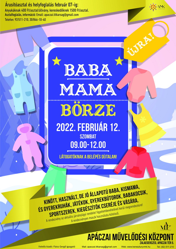 Árusító asztal és helyfoglalás február 7-ig anyukáknak 400 Ft/asztal/állvány, kereskedőknek 1500 Ft/asztal/állvány.