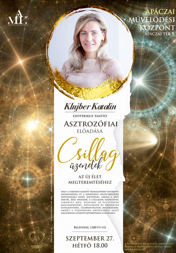 Klujber Katalin ezoterikus tanító Csillagüzenetek az új élet megteremtéséhez c. asztrozófiai előadása, mely a teremtő-alkotó-támogatóerő hatékony kifejezéséhez és a közösségi összetartóerő növeléséhez nyújt segítséget, ahogy 2021 őszétől 2022 tavaszáig a csillagok üzeneteivel ismertet meg. Inspirál az élettervek megismerésére, képességek és projektek kiteljesítésére, célorientáltság megőrzésére, ahogy a tudatosság növelésével segít megtartani a pozitív jövőképeken a figyelmet.