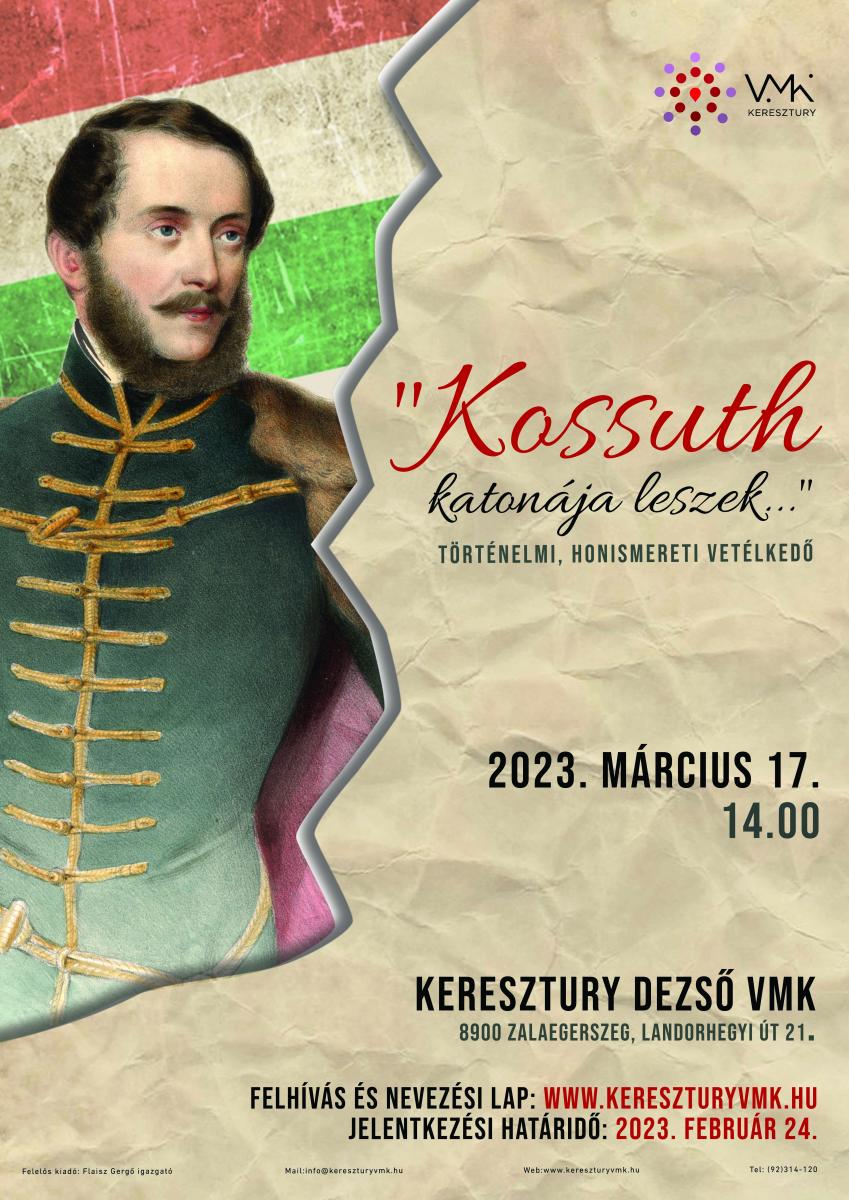 Intézményünk „Kossuth katonája leszek…” címmel történelmi, honismereti vetélkedőt rendez általános iskolák 7-8. osztályos diákjai, illetve ennek a korosztálynak megfelelő 6 és 8 osztályos gimnazisták számára, amely idén személyes részvétellel kerül megrendezésre.