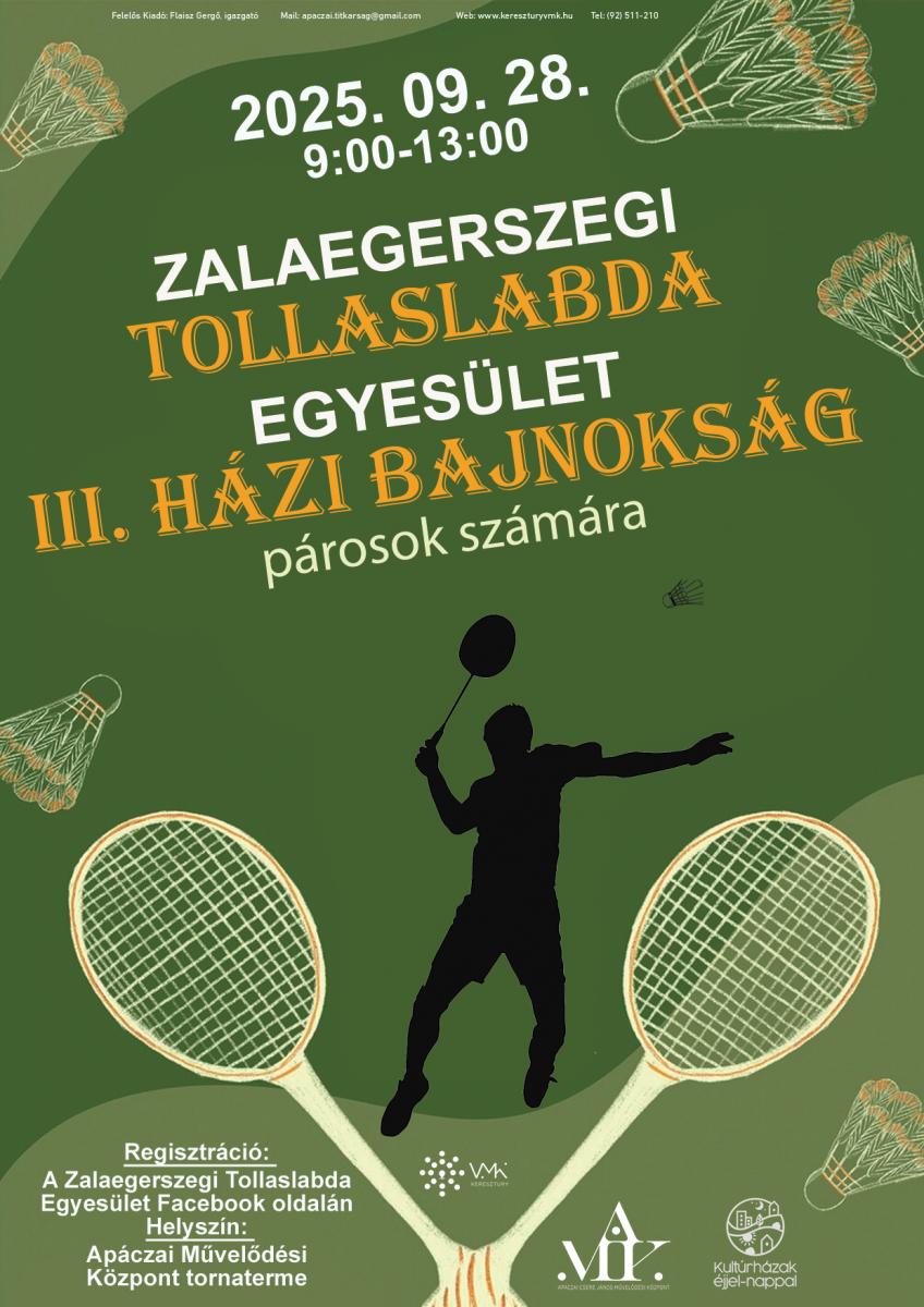 A Zalaegerszegi Tollaslabda Egyesület tagsága idén harmadik alkalommal házi bajnokságot szervez párosok számára, kezdő szinten. Regisztrálni a Zalaegerszegi Tollaslabda Egyesület Facebook oldalán lehetséges.