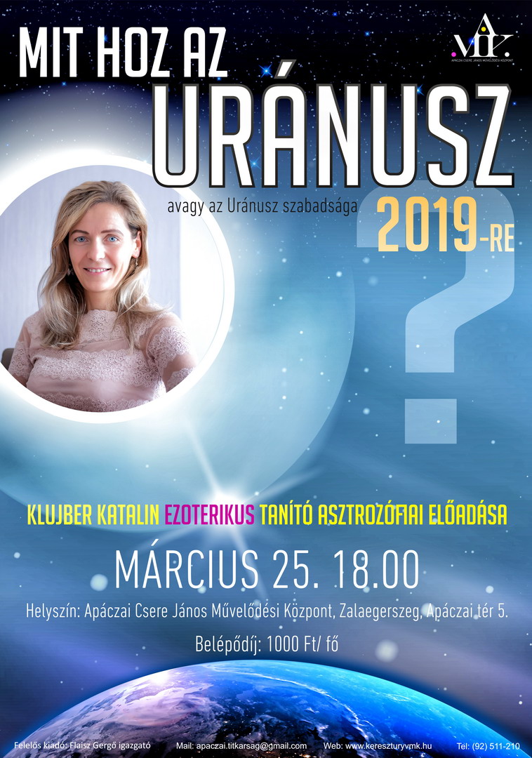 Klujber Katalin ezoterikus tanító asztrozófiai előadása Belépődíj: 1000 Ft/fő