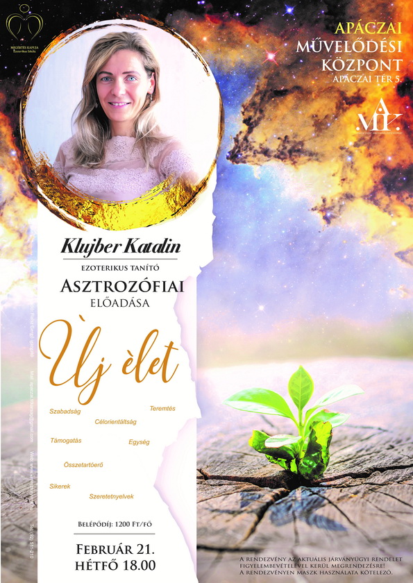 Az Új Élet című asztrozófiai előadás bevezetésként néhány szóban rávilágít a 2020-2021 években megélt változásra egy összegzéssel, az időszak szükségességének feltárásával rámutat az elért, jelentős mértékű egyéni és kollektív fejlődésre, melyet követően a 2022-es év emelkedését, új lehetőségeit, további évek távlati céljait mutatja be, az égbolt üzenete által az égi terveket, a teljesen új élet megteremtésének lépéseit ismerteti fel, melyhez rávilágít a megérkező szabadság megélésének helyes mértékére, a tudatos élet felépítésének módjára, célorientáltság megőrzésére, mellyel a teremtő-alkotó-támogatóerők helyes kifejezését teremti meg, a szeretetnyelvek kiteljesítését hozza létre, közösségek összetartóerejét növeli meg, így támogat az emelkedettség, elégedettség elérésében.