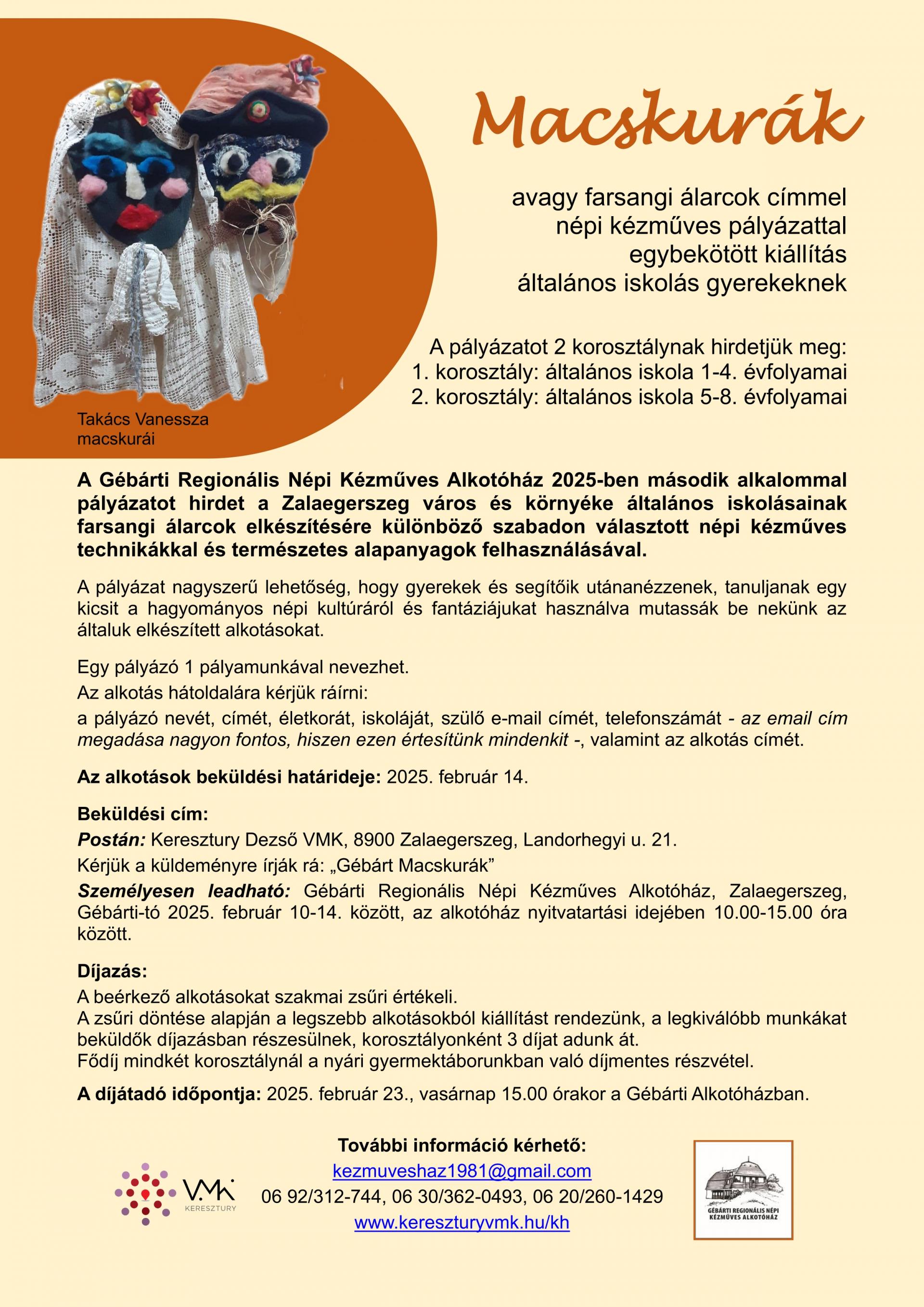 A Gébárti Regionális Népi Kézműves Alkotóház 2025-ben második alkalommal pályázatot hirdet a Zalaegerszeg város és környéke általános iskolásainak farsangi álarcok elkészítésére különböző szabadon választott népi kézműves technikákkal és természetes alapanyagok felhasználásával.
