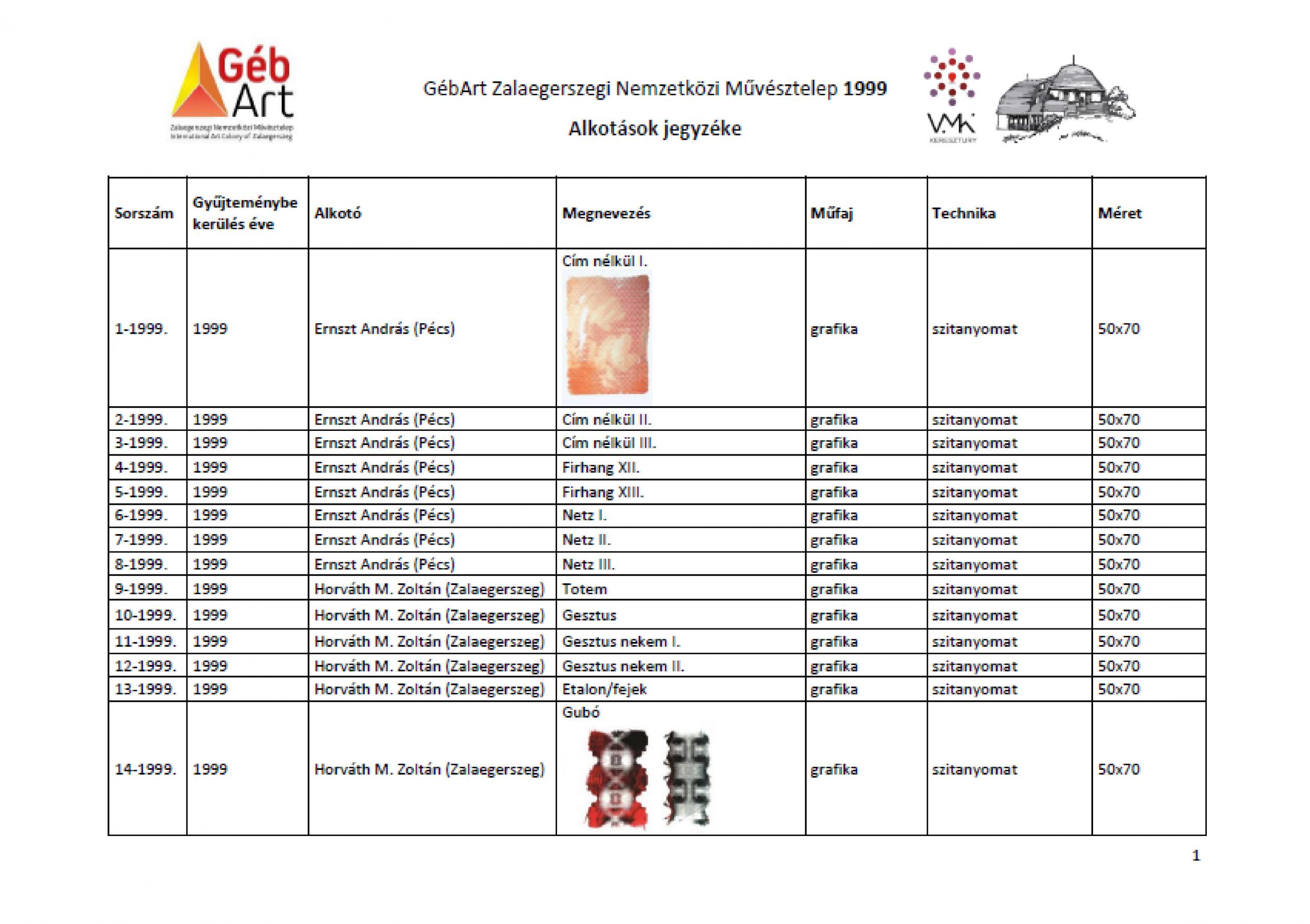 1999. évi alkotások jegyzéke