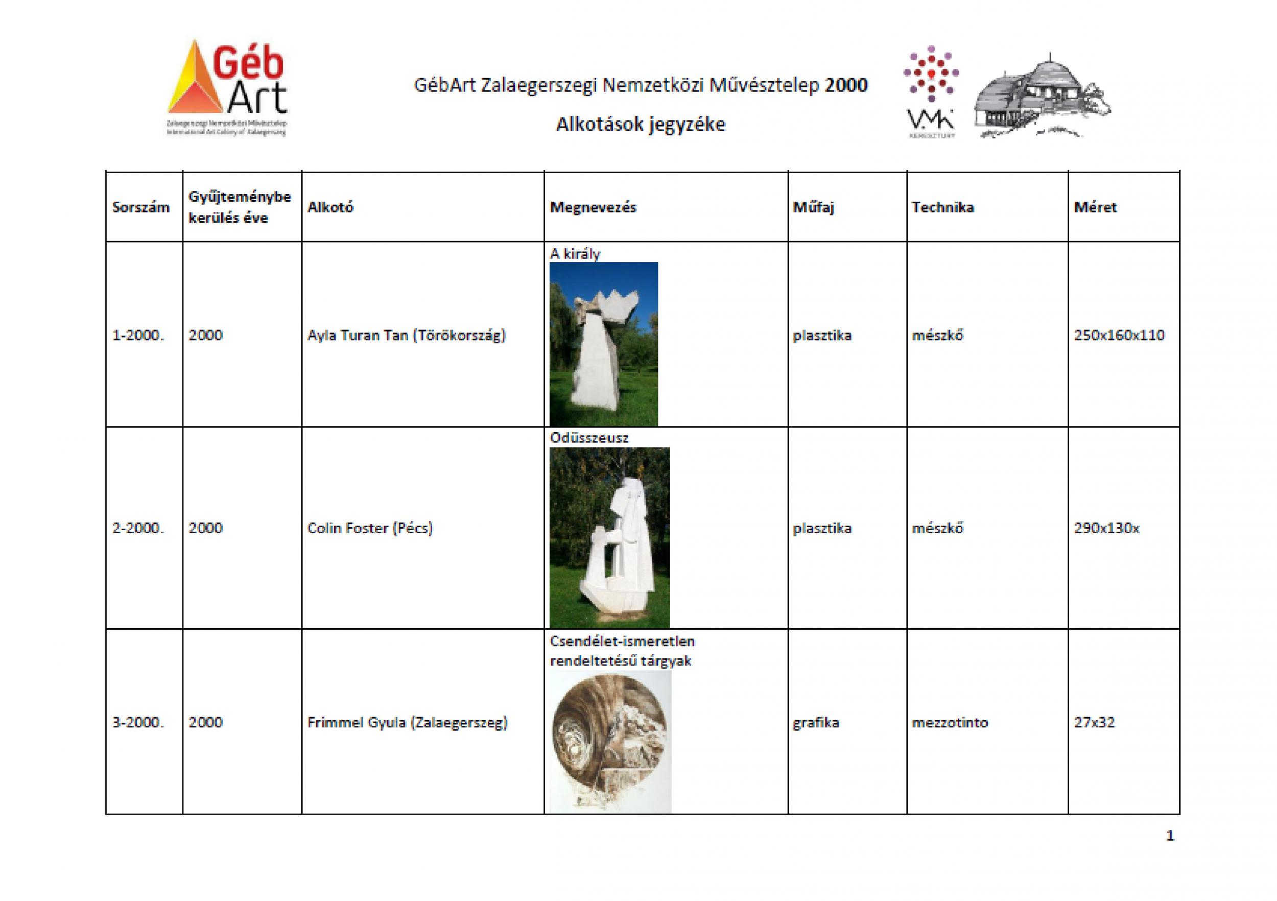 2000. évi alkotások jegyzéke
