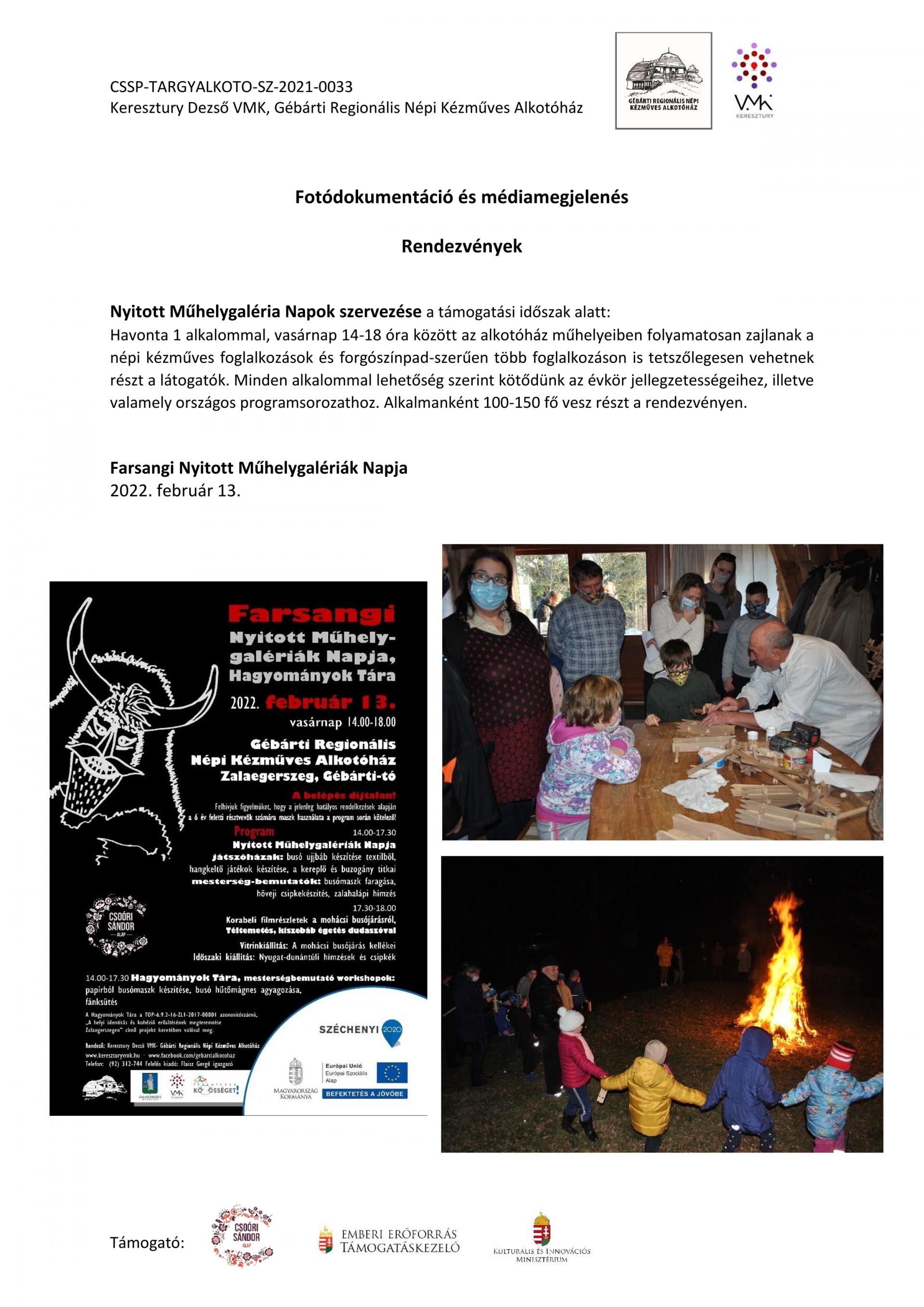 Nyitott galérianapok szervezése a támogatási időszak alatt: A Gébárti Kézművesek Háza 2004-ben indította el a „Nyitott Műhelygalériák Napja” című rendezvénysorozatot. Ősztől tavaszig havonta 1 alkalommal, vasárnap 14-18 óra között az alkotóház műhelyeiben folyamatosan zajlanak a népi kézműves foglalkozások és forgószínpad szerűen több foglalkozáson is tetszőlegesen vehetnek részt a látogatók. Minden alkalommal lehetőség szerint kötődünk az évkör jellegzetességeihez, illetve valamely országos programsorozathoz. 2021. júliusától, 2022. év végéig 6 ilyen rendezvényt tudtunk megtartani az Alkotóházban. (A 6. alkalom online tudott megvalósulni intézményegységünk bezárása miatt december hónapban.) Ezek visszanézhetőek archívumunkban: Archívum - Keresztury Dezső VMK Zalaegerszeg (kereszturyvmk.hu). Minden ilyen alkalomhoz szórólap készült.