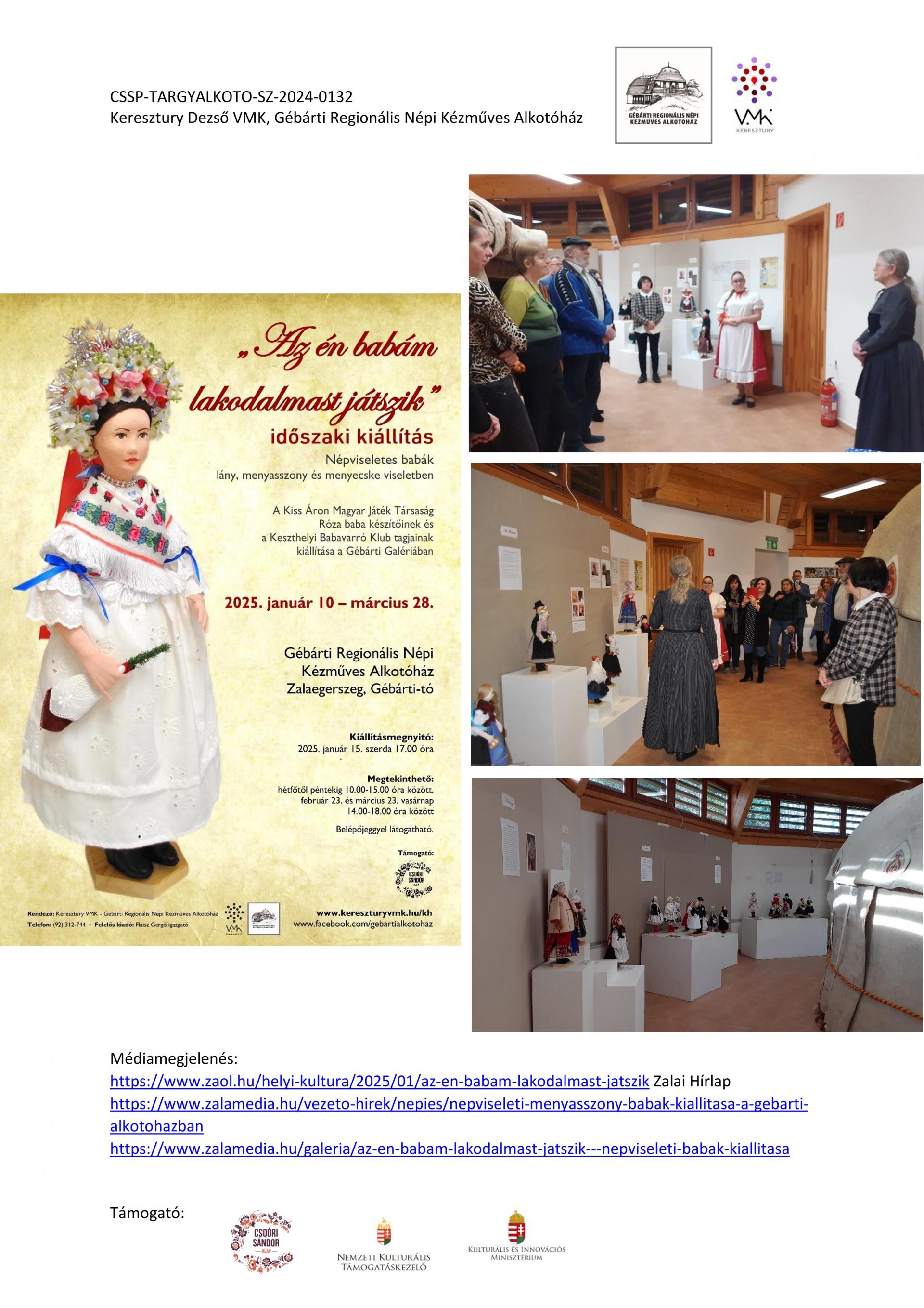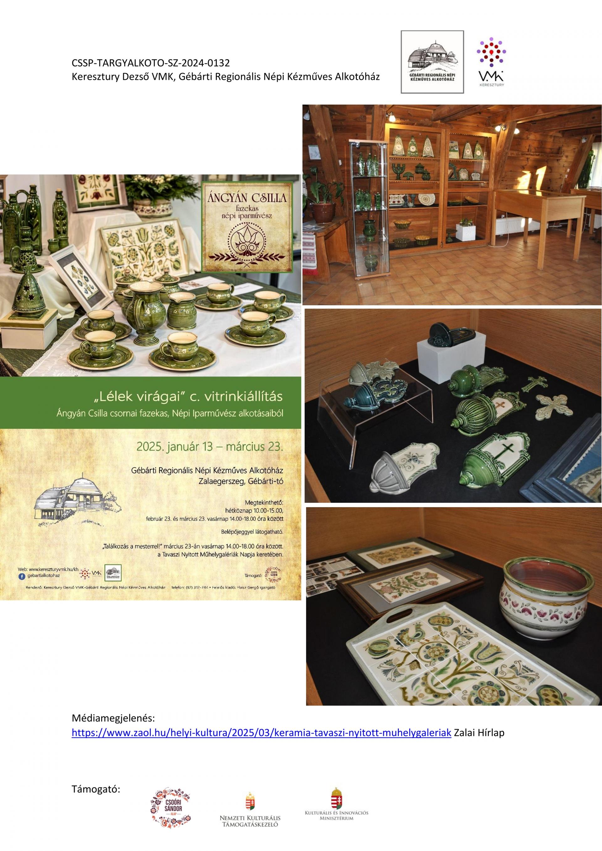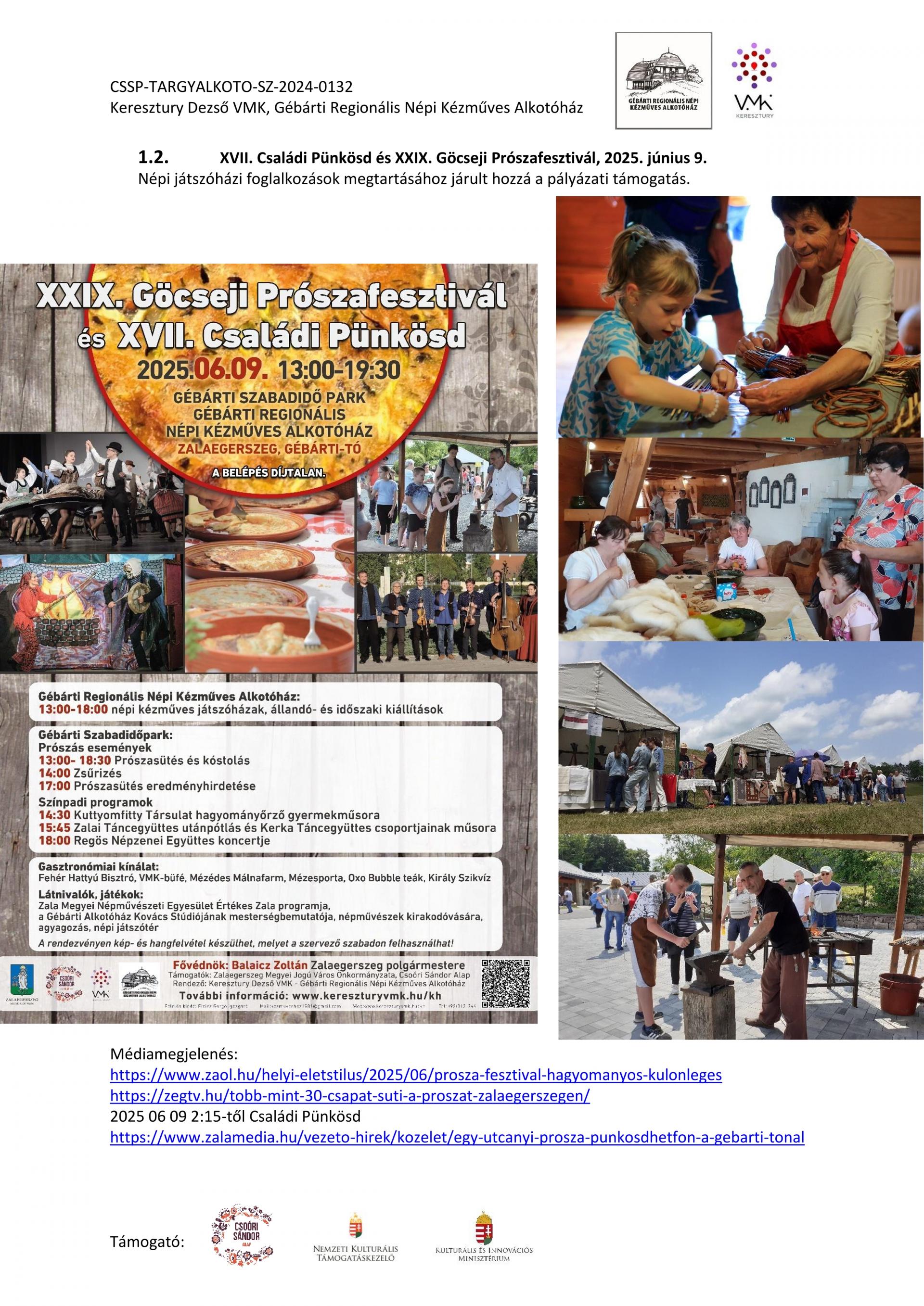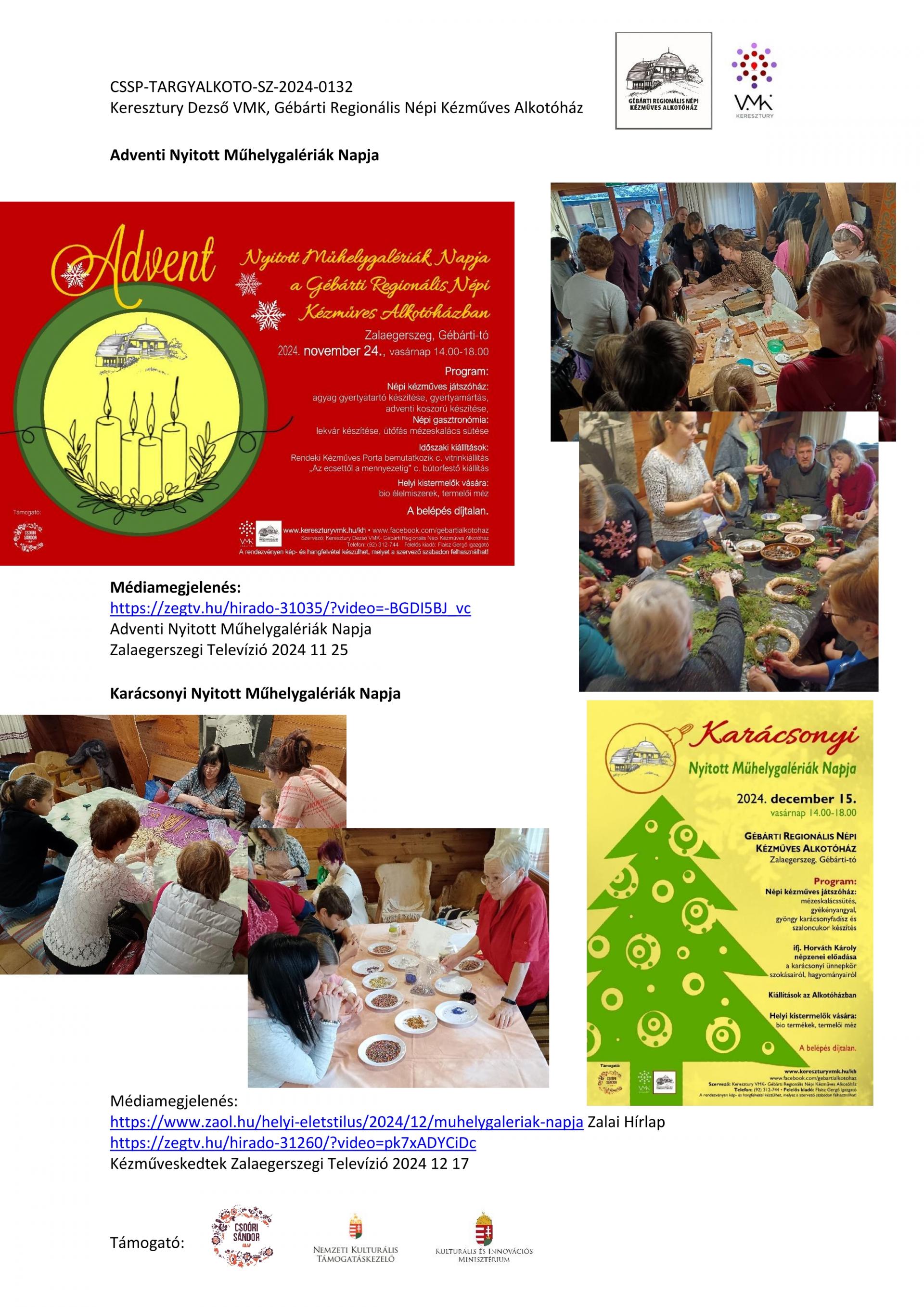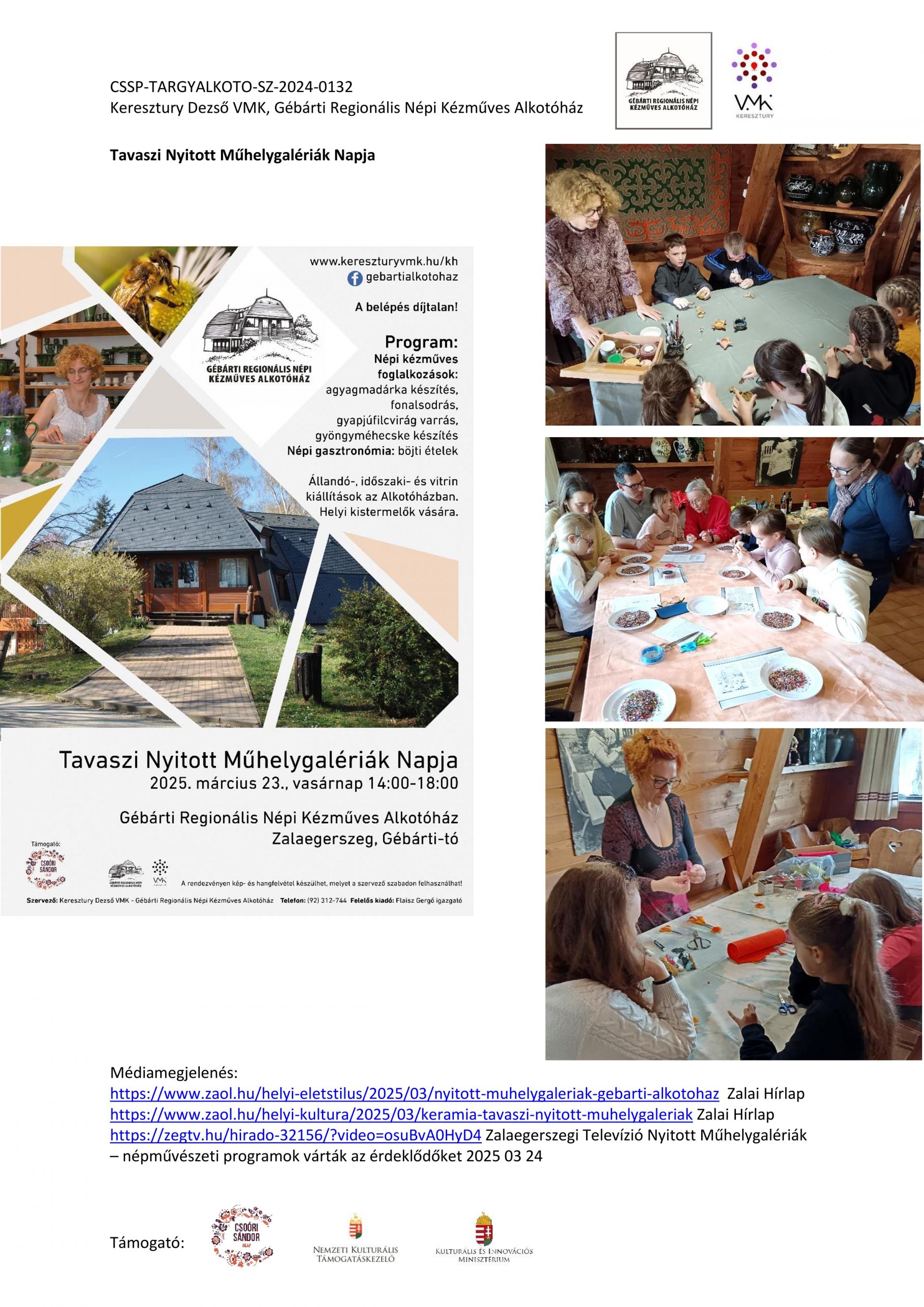 Nyitott Műhelygalérianapok szervezése a támogatási időszak alatt: A Gébárti Alkotóház 2004-ben indította el a „Nyitott Műhelygalériák Napja” című rendezvénysorozatot. Ősztől tavaszig havonta 1 alkalommal, vasárnap 14-18 óra között az alkotóház műhelyeiben folyamatosan zajlanak a népi kézműves foglalkozások és forgószínpad szerűen több foglalkozáson is tetszőlegesen vehetnek részt a látogatók. Minden alkalommal lehetőség szerint kötődünk az évkör jellegzetességeihez, illetve valamely országos programsorozathoz. 2024. júliusától 2025. év augusztusáig 6 ilyen rendezvényt tudtunk megtartani. Ezek visszanézhetőek archívumunkban: Archívum - Keresztury Dezső VMK Zalaegerszeg (kereszturyvmk.hu). Minden alkalomhoz szórólap készült.