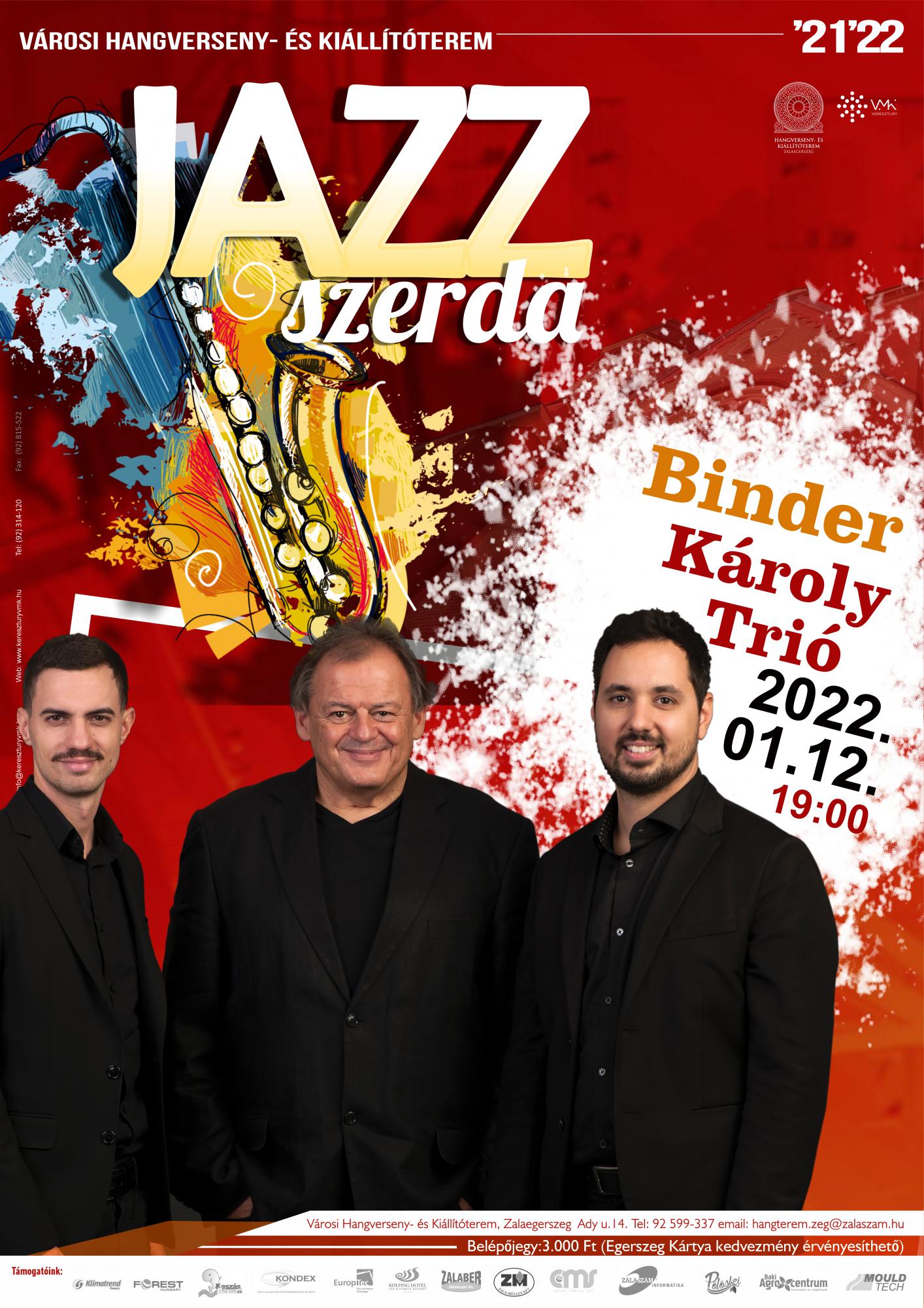 Binder Károly zeneszerző, zongoraművész a hetvenes évek második fele óta a magyar zenei élet megkerülhetetlen alakja. Munkássága a modern mainstream jazztől a kortárs és avantgárd klasszikus zenén, valamint az úgynevezett magyar népi free jazzen keresztül a népzenéig számos műfajt és stílust ölel át. Egyaránt kedveli a nagyobb kamarazenekari és a kisebb felállásokat, valamint a szólózongorát is. Ezúttal trió formációban lép fel, ahol muzsikustársai a fiatal generáció két különleges tehetsége, Fonay Tibor bőgős és Hidász Tamás dobos lesznek.